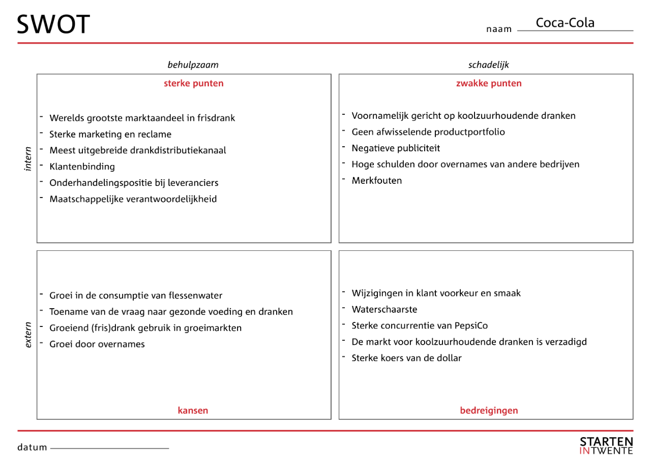 Print de template van SWOT groot uit. Download het voorbeeld van Coca-Cola en leer van de praktische toepassing van de SWOT.