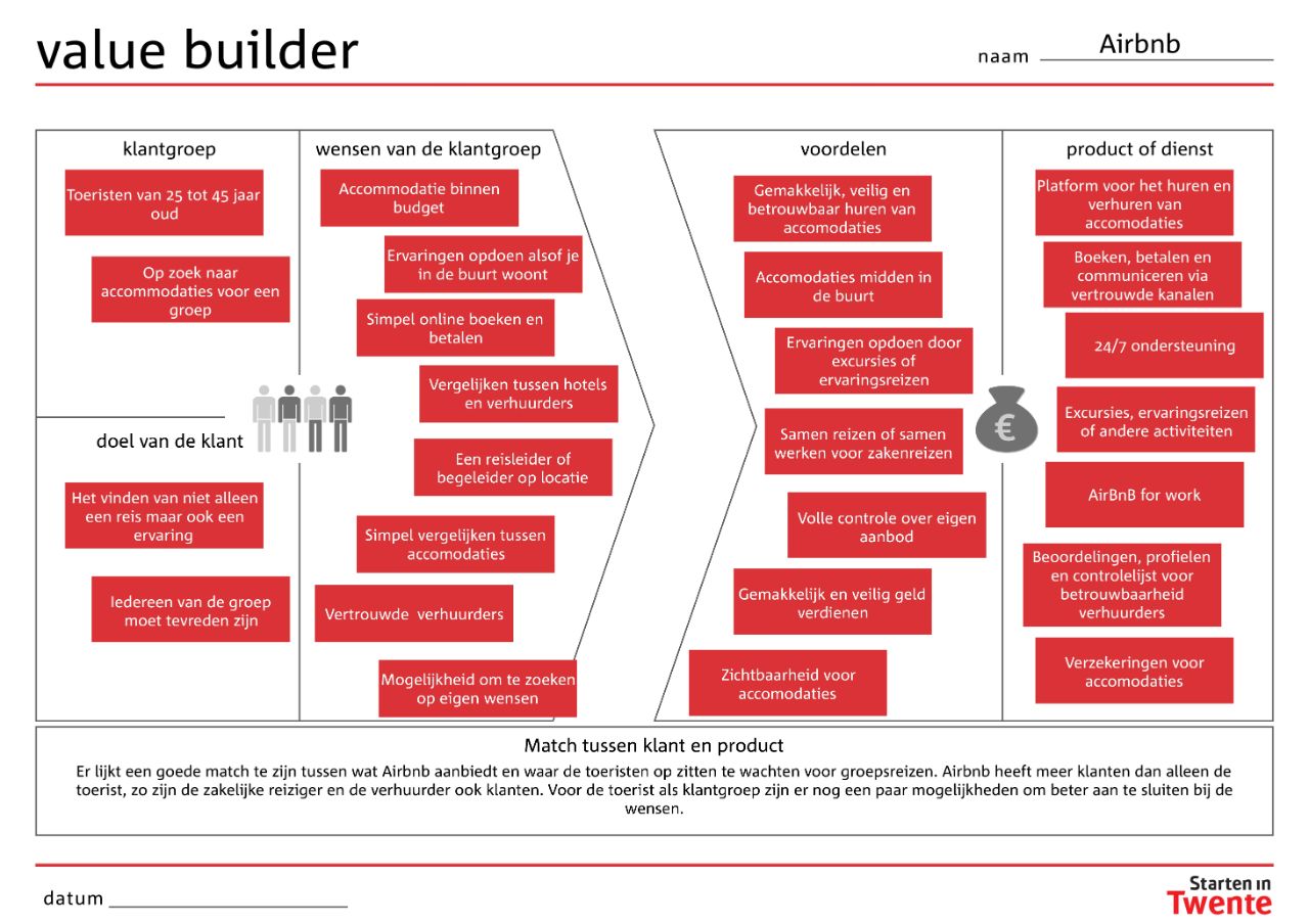 Download het Value Builder canvas en print deze op een groot stuk papier om te gebruiken tijdens een brainstormsessie. Om te zien hoe je de Value Builder in de praktijk kan gebruiken kun je het voorbeeld van Airbnb downloaden.